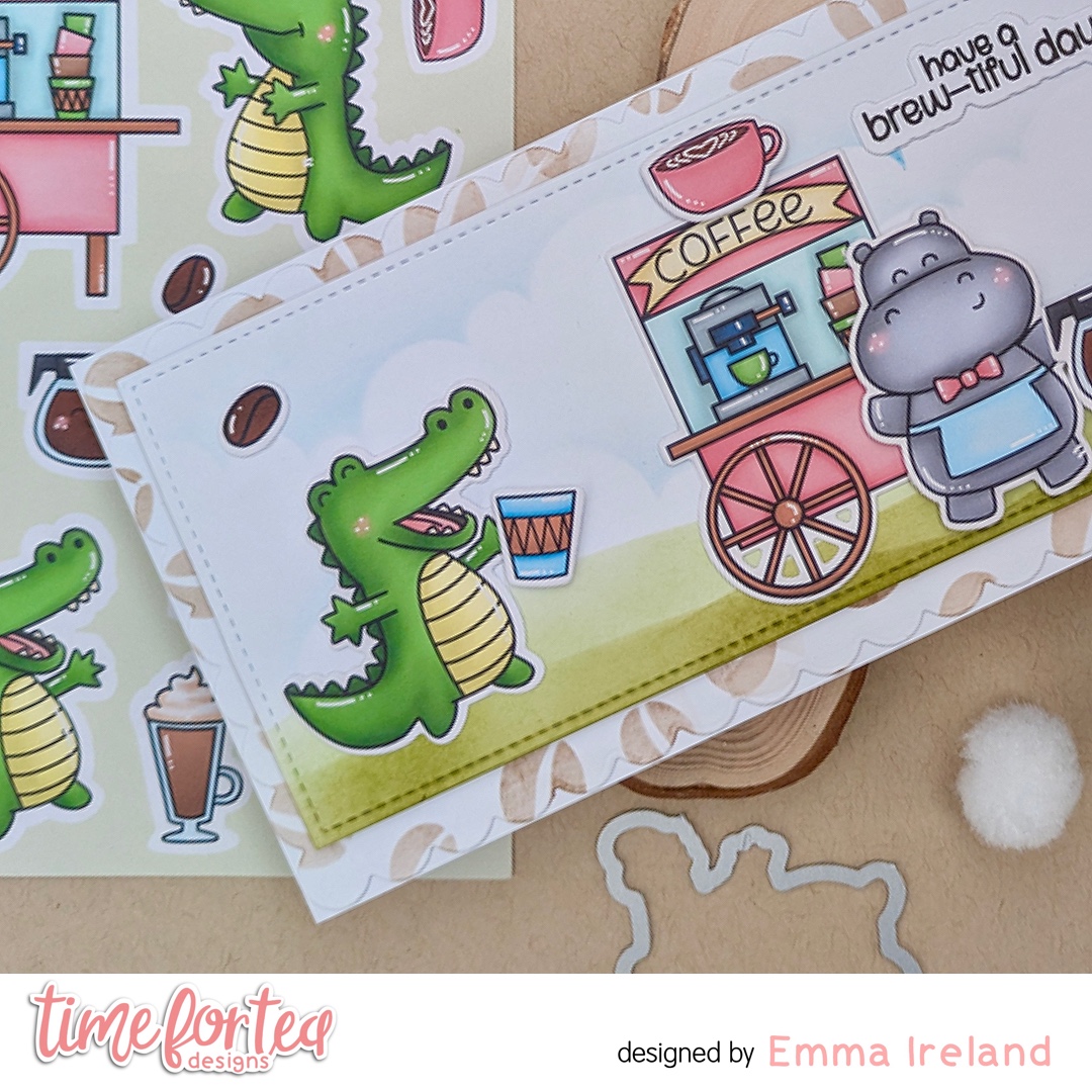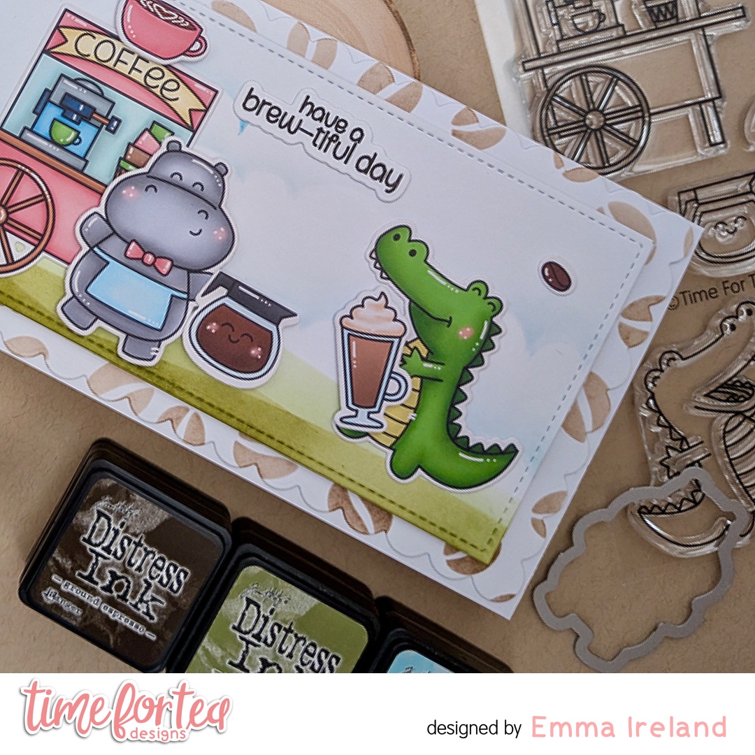 Hello Tea Timers. DT Emma here and I’m back today with a new card featuring the ‘Snappy Before Coffee’ A4 Printed Card-stock and coordinating die set, alongside the ‘Coffee Beans’ and the ‘Scene Builder’ 6 x6″ Stencil from Time for Tea Designs. I could not resist using these again, I just love them so much!